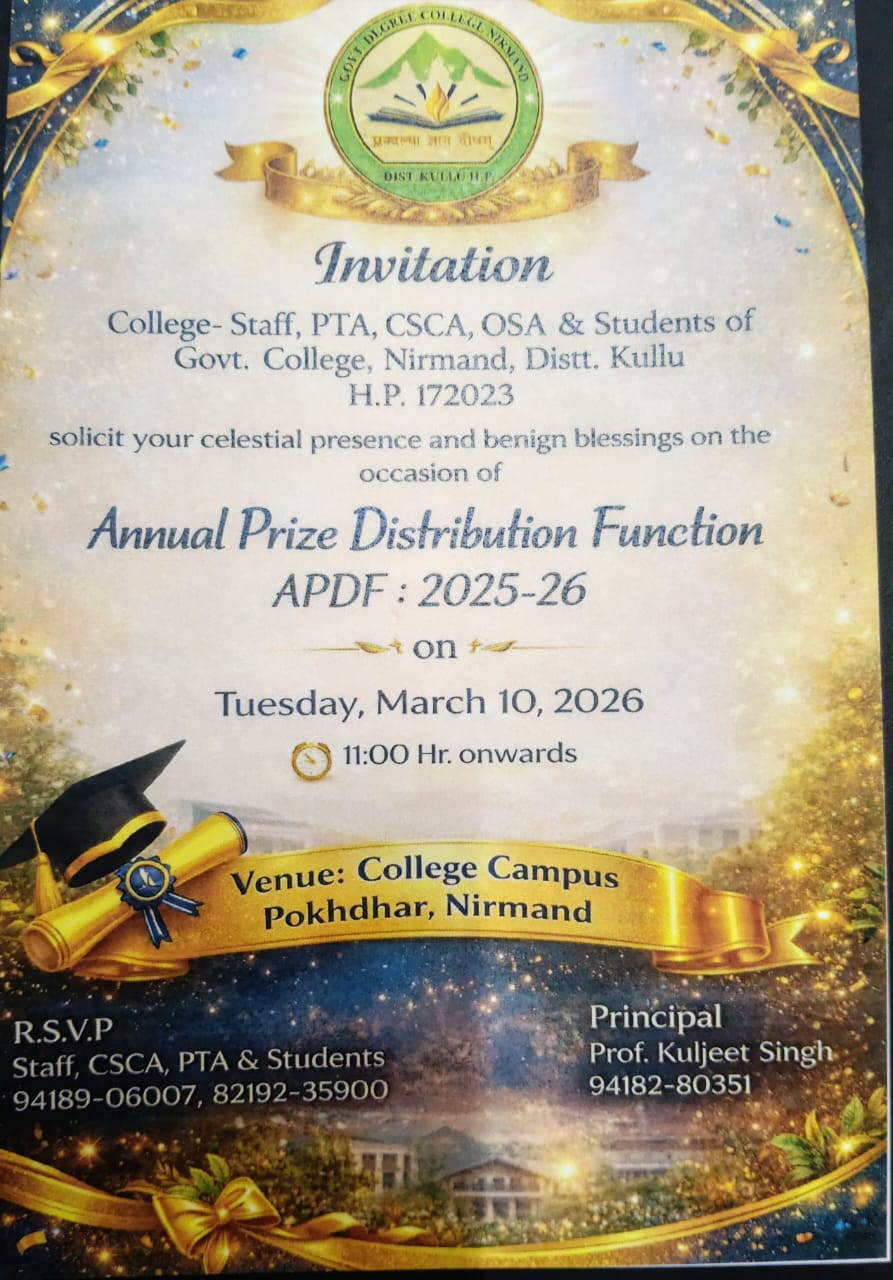 Govt. Degree College, Nirmand, is a co-educational institution established in the year 2016 to empower the young minds of one of the largest villages in Himachal Pradesh— Nirmand, through a culture of academic rigor, creativity and discipline. Since its inception vide notification No. EDN-A-KA(1)4/2012, dated 16th May 2016, of the Govt. of Himachal Pradesh, the institution has been functioning in the building of Govt. Primary School (Nirmand) and it offers two undergraduate programmes—Bachelor of Arts and Bachelor of Commerce. With its humble beginning with a strength of 40 students, the college today stands committed to foster a spirit of academic excellence and holistic growth among 160 students of the college. The dedicated teachers of the college adopt a personalized approach to engage with students to guide them on the path of critical thinking and effective communication....